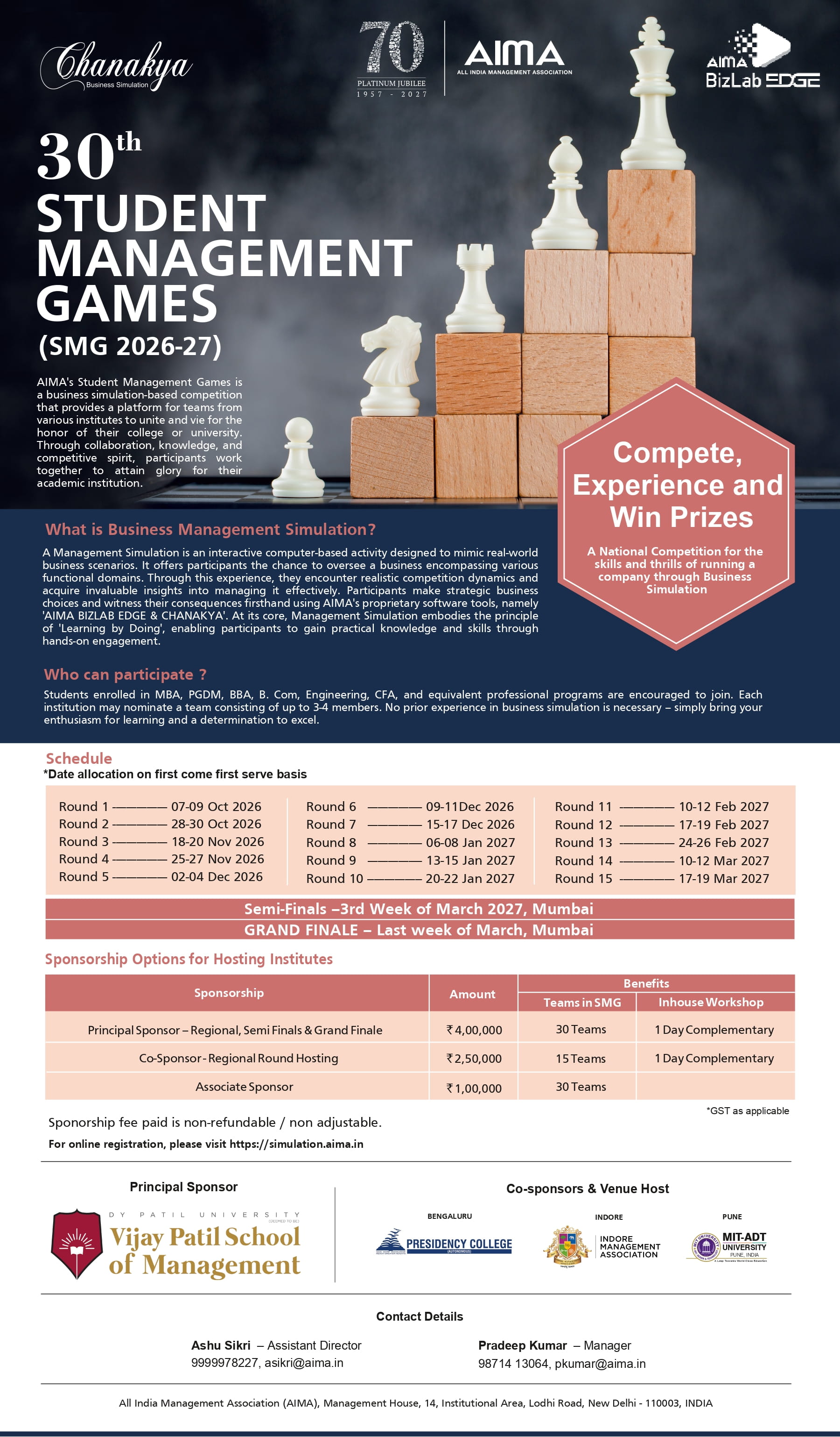 These are organised primarily for students at business schools and professional/academic institutes to help them hone their decision-making skills in a realistic simulated business environment. SMG is National Championship played across the country. Management Simulation is a computer-based event that simulates a Business Scenario. It creates an opportunity for the participants to manage a business with multiple functional areas. They get to experience active competition and the perspective to handle it. They take strategic business decisions and see the impact through AIMA’s indigenously developed software ‘CHANAKYA’. The essence of Management Simulation is ‘Learning by Doing’. All kinds of students can participate including Engineering, Sciences, Business, anybody who aspires to be a part of the Corporate World. One could be in a Graduate or Post Graduate School. The entire module works even better for students coming from a non-commerce/business background, it gives them a learning that elevates their exposure/experience scale instantaneously over their peers.